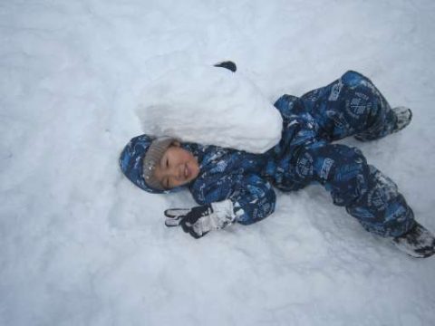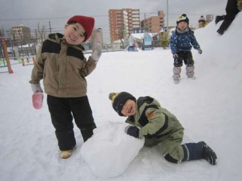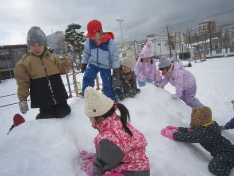 雪山の上に登ってお尻で滑ってすべり台を楽しんだり