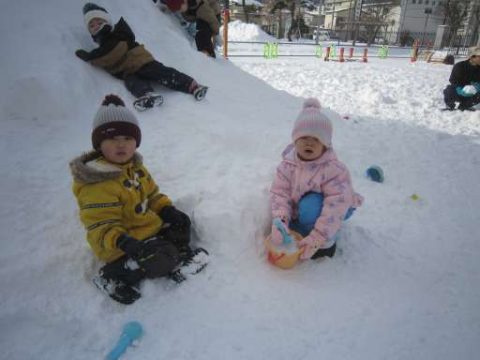 スコップやバケツで氷や雪を集めて楽しんでいました。中には大きな雪の塊を運んでいるお友だちもいました☆