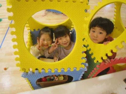 お遊戯室では、パネルでお家を作りお友だちと仲良く入ってままごとをしたり