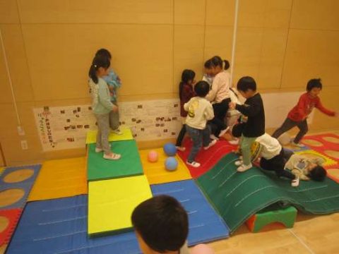 マットや大きなソフト積み木でサーキットをつくり、ジャンプや寝転んで遊びました☆