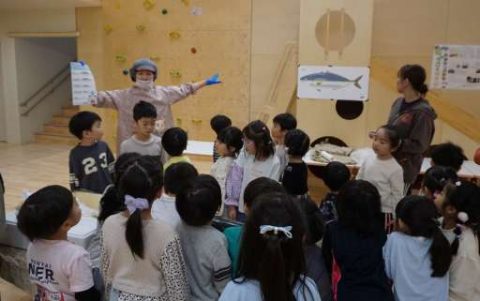 給食のシダックスさん主催の手洗い講座&もぐちゃんとの触れ合い会の終了後、お遊戯室では大きなお魚がみんなを待っていました😊
