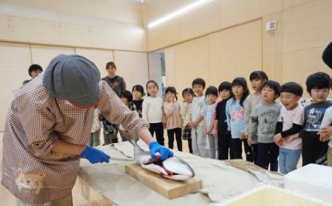 さあいよいよブリに包丁が入ります。さばく方も見る子ども達もみんなドキドキしています😊