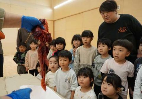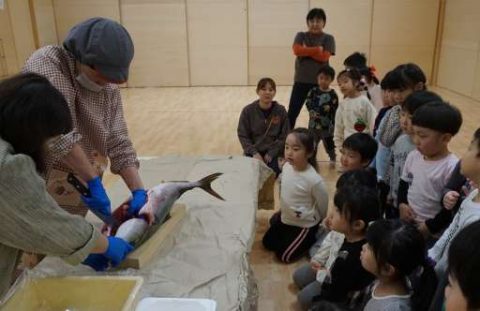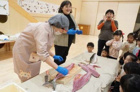 海洋生物に興味があるふじ組さんの話を以前から伝えていたところ、今回は実際に子ども達の目の前で、包丁を使って魚をさばくところ見せてくださる事になりました。