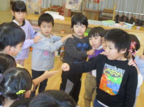 「じゃんけん列車やろう!」とスタートすると、あっという間に2つの車両になり、どっちが先頭になるのか、「最初はグー!」と緊張の一瞬です✊✌✋みんなも見守っていますね!