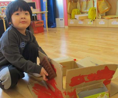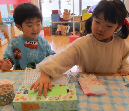 お部屋では、のりを使った廃材遊びを楽しんでいるお友だちがいました✂✏「のり乾いたかな~?」と何度も触って確認し、作品の完成に期待を膨らませていました☘