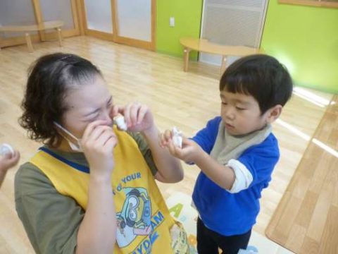 オバケを作り先生に「おばけだぞー👻」と近づき先生が「こわいよー」と泣いています😢