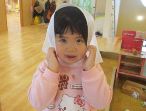 「帽子みたい!」 顔の下でテープをぺたっと貼り帽子の完成です👒