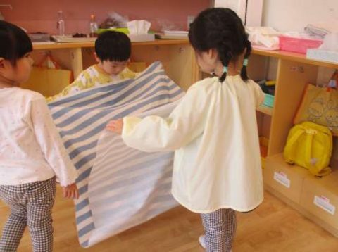 お片付けもお友だちと協力して行います👐大きなテーブルクロスを二人でぱったん!