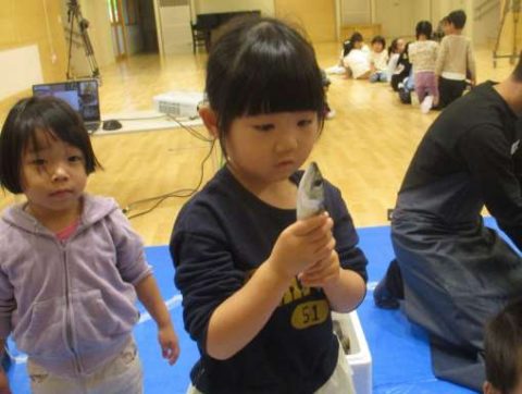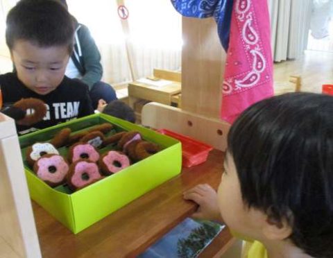 廃材コーナーで大きな箱を見つけたお友だちは、ギャラリーに持っていき、「いらっしゃいませ~」とドーナツ屋さんの開店です🍩