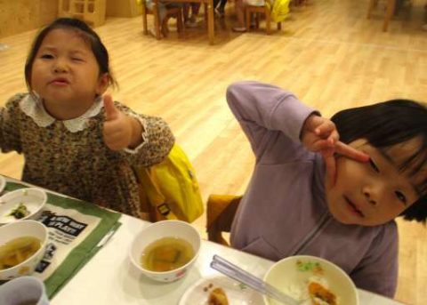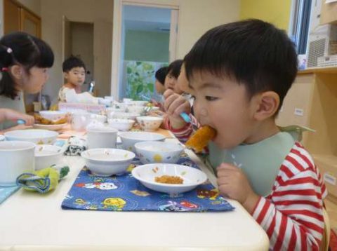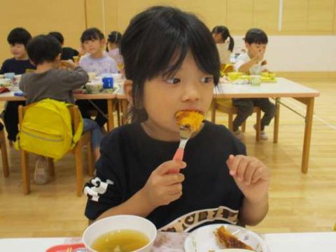 「お肉を入れて・・・🍖」と材料もすべて廃材で見立てて、火にかけてコトコト煮込んでいると、「いい匂いしてきた!!」とこの表情です🤭
