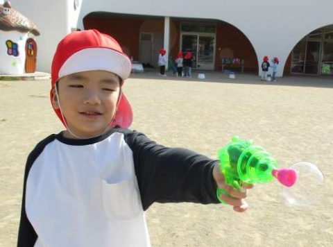 園庭ではシャボン玉に夢中です🫧鉄砲型のシャボン玉を持ってかっこよく決まっています✨