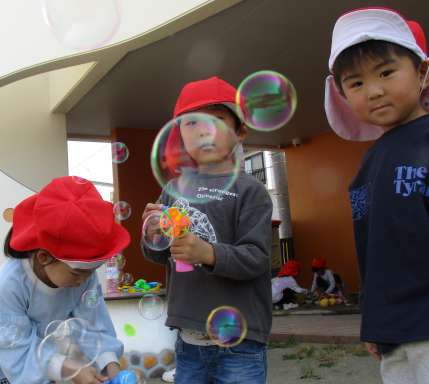 「いっぱい出る!!」とぐるぐる回すシャボン玉に興味津々のぼたん組さんでした🌞