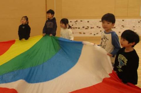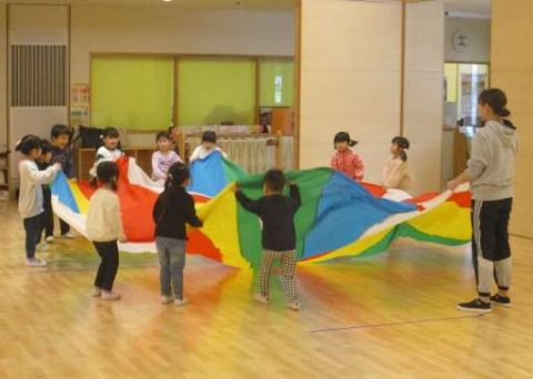 お兄さんが持ってきたパラバルーン。やりたいお友だちで集まって、パラバルーンがスタート!お兄さんの進行をよく聞いています😊