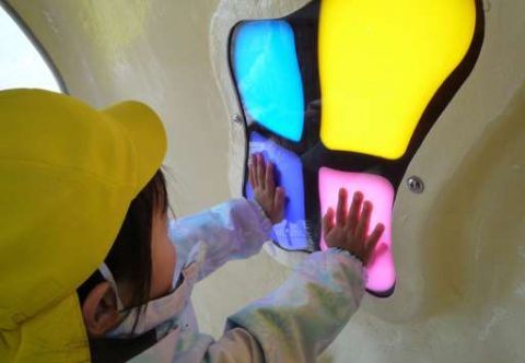 すべり台の下はたくさんのタイヤが付いたかっこいい車になっていました🚗「ヤッホー🙌」ドライブ中です!