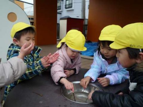 テーブルのボウルの中に水を発見👀!すぐに木の枝を見つけてみんなでまぜまぜ🌀楽しいクッキングがスタートです🎵