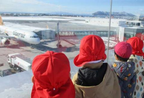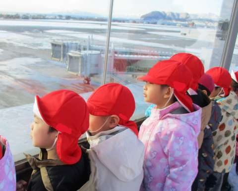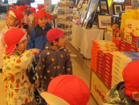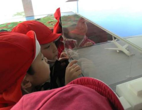 お土産がたくさん並んでいたり、飛行機の模型があったり、色々な物に興味津々のぼたん組さん!