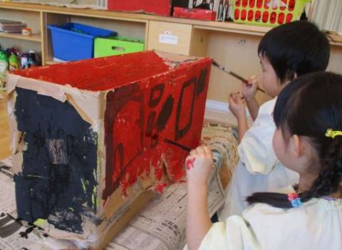 幼稚園に戻ると早速、空港用化学消防車づくりをするぼたん組さんでした🎨