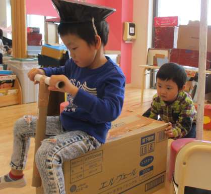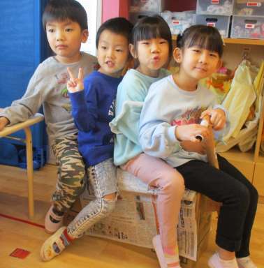 シートなどもこだわって、段ボールや新聞紙を使って上手に作り上げていました✂「4人も乗れるよ!!」とみんなで記念写真です📸