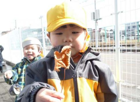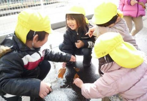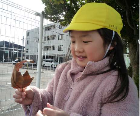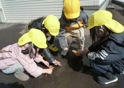 今日のお散歩コースには・・何か所も水たまりがありました!お友だちと手を繋ぎながら上手に避けて歩き、無事境内に到着😊境内では、いつもの葉っぱ🍂探しがスタートです🎵