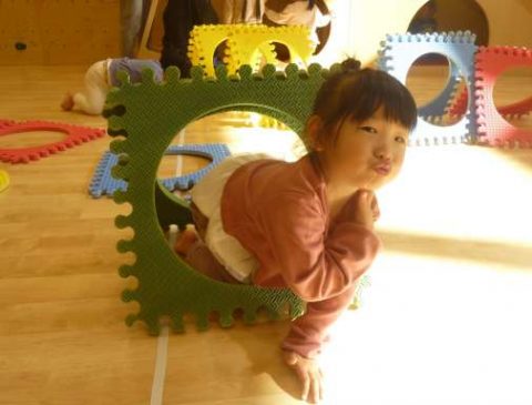 朝の自由遊びの時間、遊戯室で走ったり、ジャンプしたり・・体をたくさん動かしました!遊戯室には暖かい秋の日差しが🌞ポカポカ暖かくいい気持ちです🤗パズルマットで三角を作りテントみたい!⛺