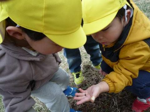 まだ小さいダンゴムシさん・・優しく手にのせると‥「ちいさいね!」「まだあかちゃんかな?」