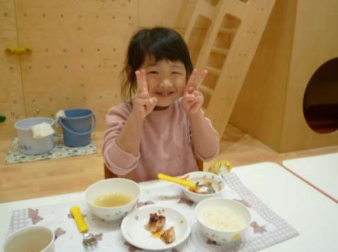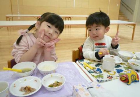 今週からお遊戯室で給食を食べているつぼみ組さん😊いつもと違う環境ですが気分はすっかりさくら組🌸さんです😊