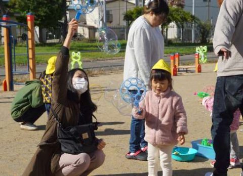 お友だちの顔より大きなシャボン玉や何個もくっついたシャボン玉など・・
