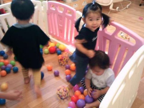 サークルの中ではボールプールで泳いでいる子や両手いっぱいにボールを持つ子など自由に遊んでいます🥎