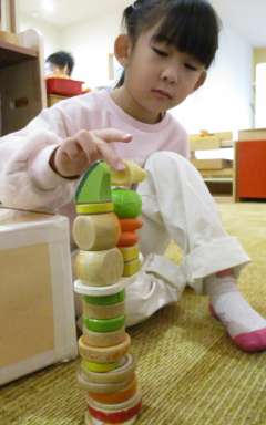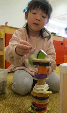「バランス、バランス・・・」そーっとそーっと集中して取り組んでいたのは、食べものタワーです🍎🍈🍊