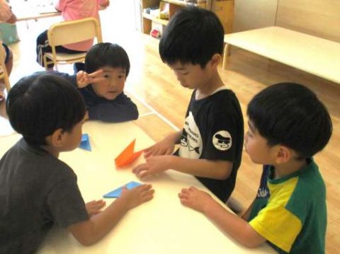 折り紙の方法をお友だちに教えてあげています。「こうやってやるんだよ!」