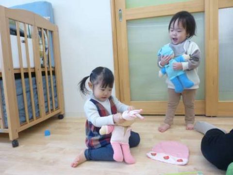 赤ちゃんと言っても赤ちゃんの人形ですが、0歳児クラスの子が増えてきたこともあり興味が出てきたようです🥰