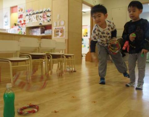 色水のペットボトルを積み重ねたタワーに輪投げの輪をゆっくりゆっくり通しています!「ゆらゆらするからゆっくりね!」と声を掛け合いながら挑戦中です😊みんな真剣に見つめています👀
