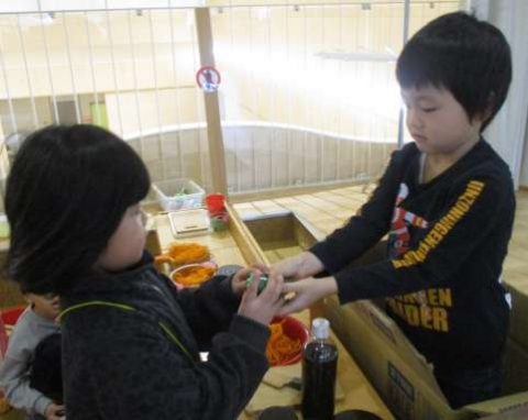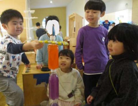 ギャラリーでは、色水をジュースにしたり、輪投げのピンにしたり、色々な物に見立てて遊びを楽しんでいます🌟今日は憧れの献灯献花の練習をしているお友だちがいました🤭それぞれの立ち位置から登場し、何度も何度も楽しみながら練習していました✨